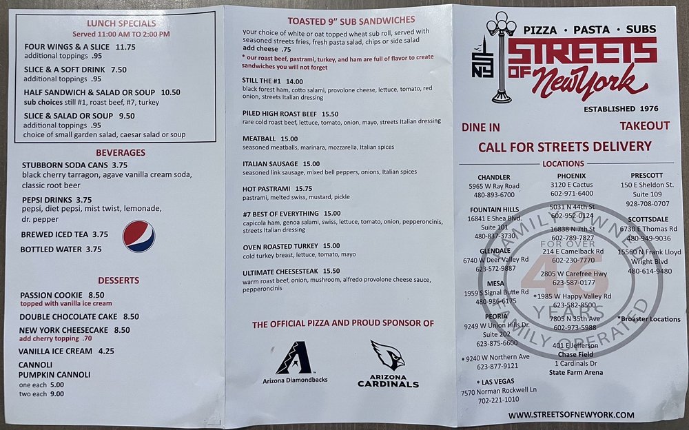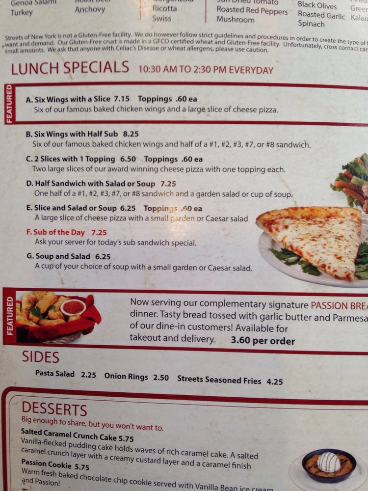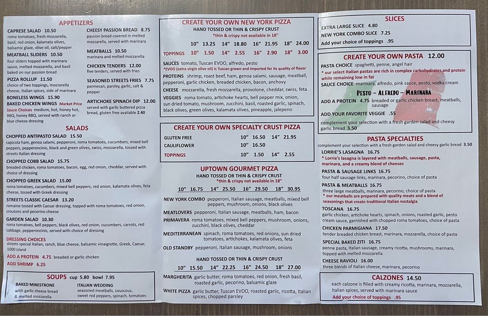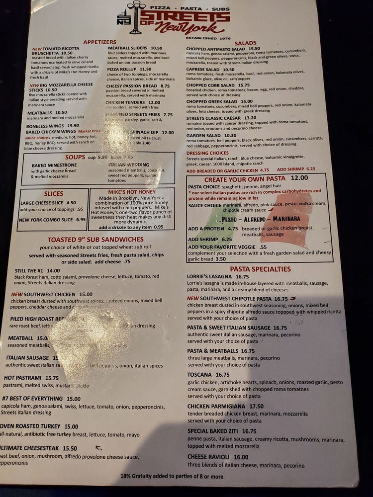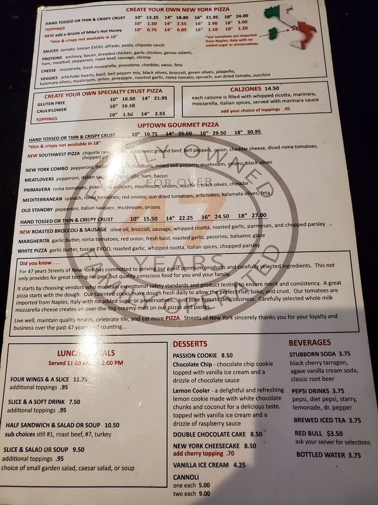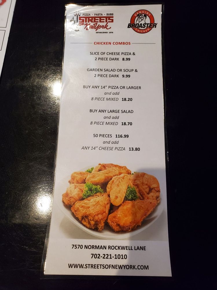 Streets of New York, located on 7570 Norman Rockwell Ln Las Vegas, NV 89131, is a versatile restaurant offering a wide array of menu options. From creating your own pizzas with up to 3 toppings to indulging in their Uptown Gourmet Pizzas like the New York Combo or Divine Swine, there is something for every pizza lover. Customers rave about the freshness of the ingredients, the delicious flavors, and the friendly service. With options for gluten-free pizzas and a variety of other dishes like wings, salads, and pasta, Streets of New York is more than just a pizza placeāit's a culinary experience that keeps customers coming back for more. The casual ambiance, TV screens, and attentive staff make it a great spot for families, friends, and pizza enthusiasts alike. So, if you're craving a taste of New York in Las Vegas, Streets of New York is the place to be.